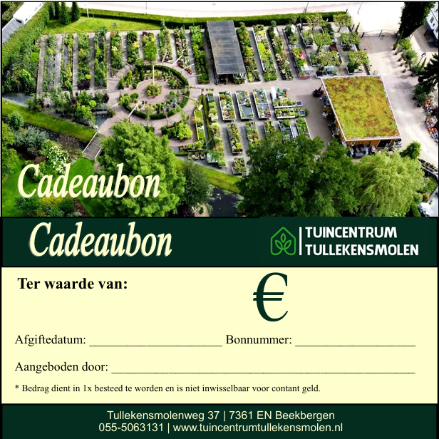 Tuincentrum Tullekensmolen biedt groene cadeaubonnen aan, waarmee u de ander een groot plezier zult doen. De cadeaubon zullen wij altijd voorzien van een klein extraatje voor de ontvanger, en pakken wij natuurlijk feestelijk voor u in. De bonnen zijn uitsluitend bij ons tuincentrum te besteden. Het bedrag dient in 1x besteed te worden en is niet inwisselbaar voor contant geld. Verzenden van de cadeaubonnen kan uiteraard ook. De cadeaubon is NIET inwisselbaar in de webshop.