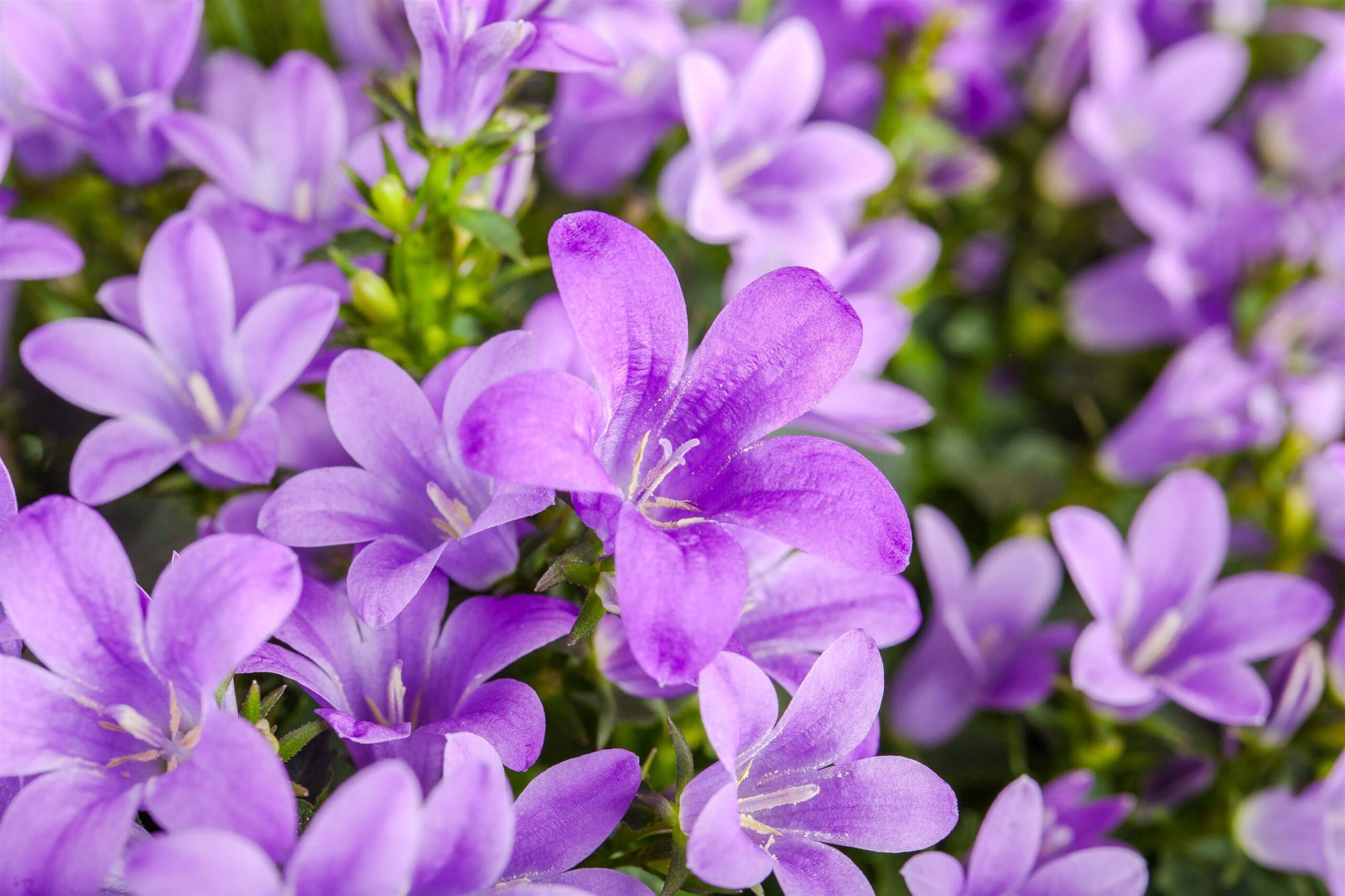 De laagblijvende klokjesbloem geniet van een zonnige plek in de tuin, de licht blauwe bloemetjes vallen gelijk op.