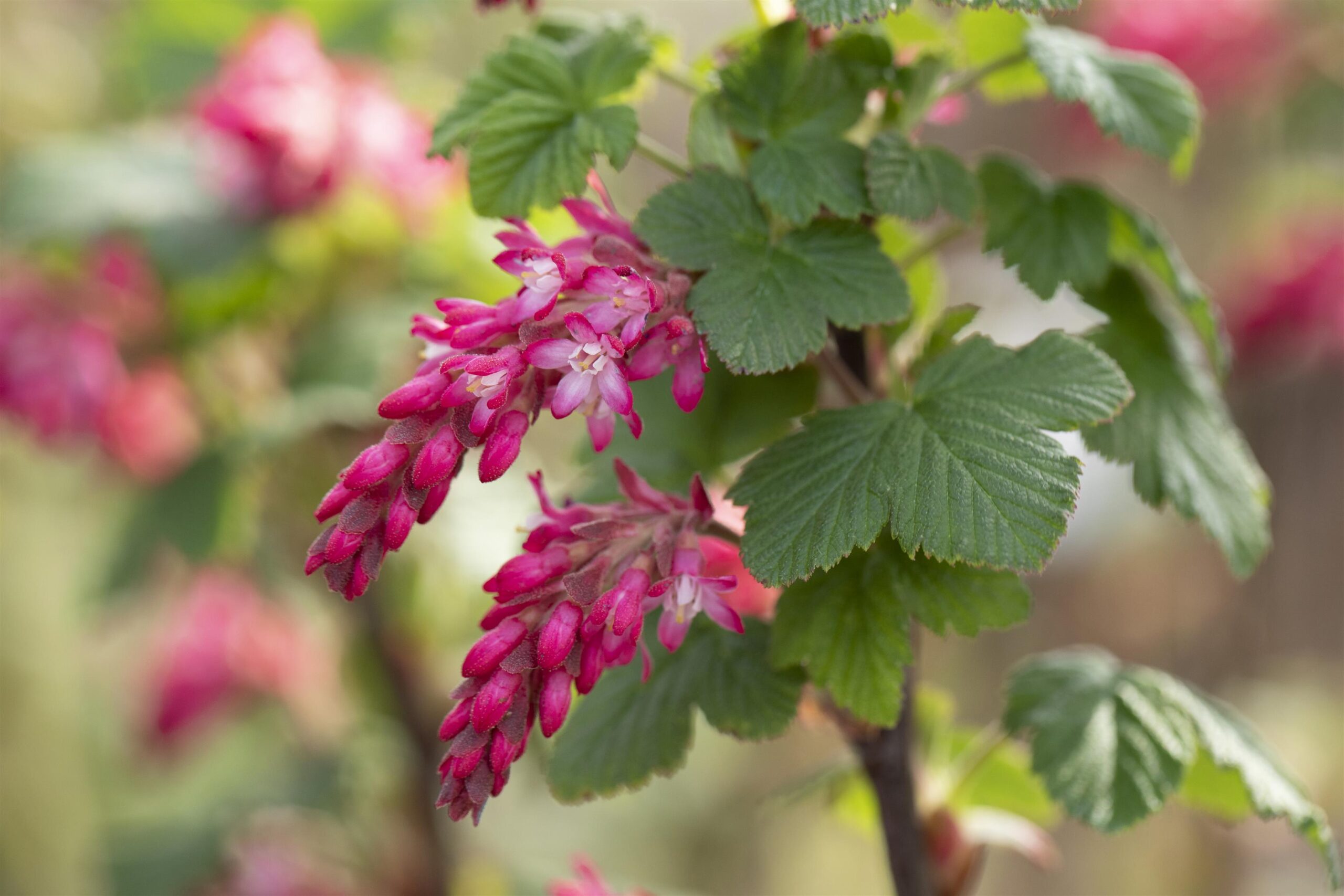 Deze Rode ribes of Siertrosbes op stam bloeit uitbundig in het voorjaar met donkerroze trossen vlak voordat het blad volledig is uitgelopen