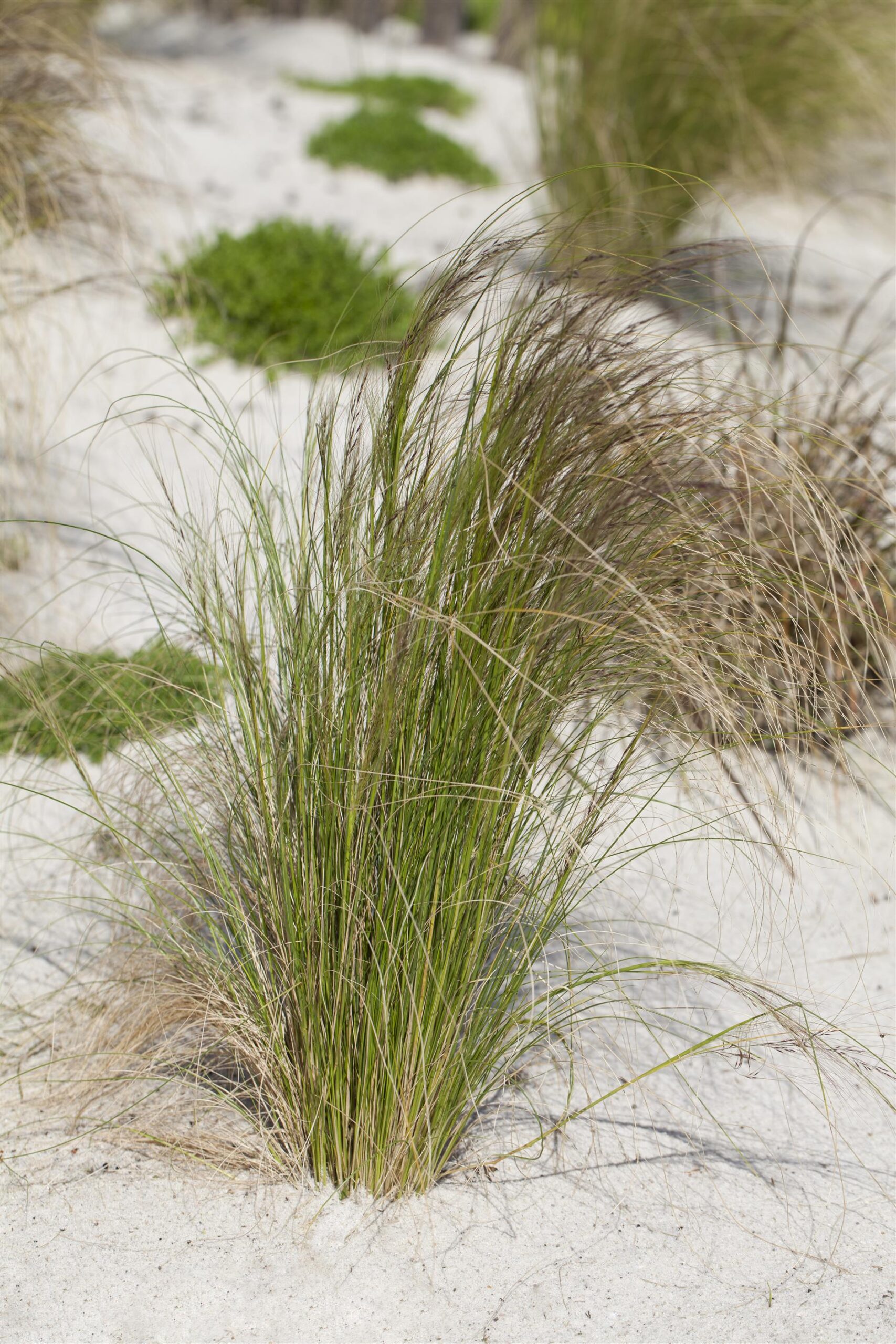 De fijne haarachtige structuur van de vedergras is typerend. De lichte halmen zijn geven een dansend effect.