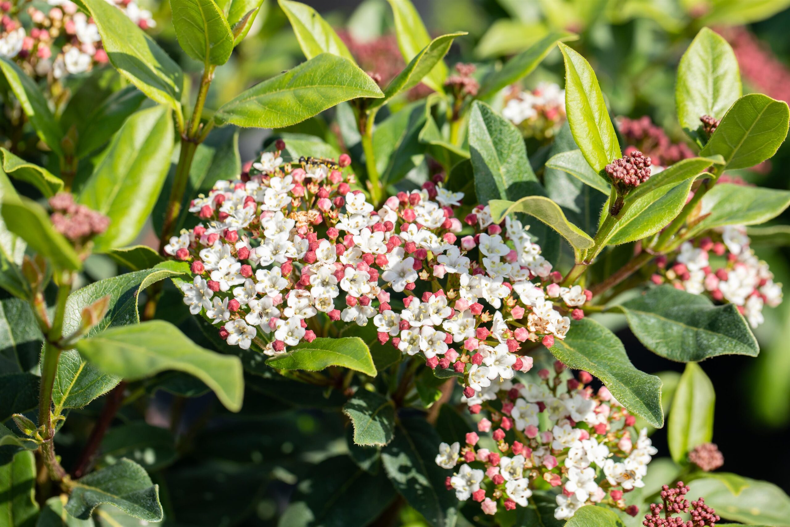Groenblijvende Sneeuwbal op stam bloeit in de winter voorjaar met witroze bloemen en vormt dan donkerblauwe bessen.