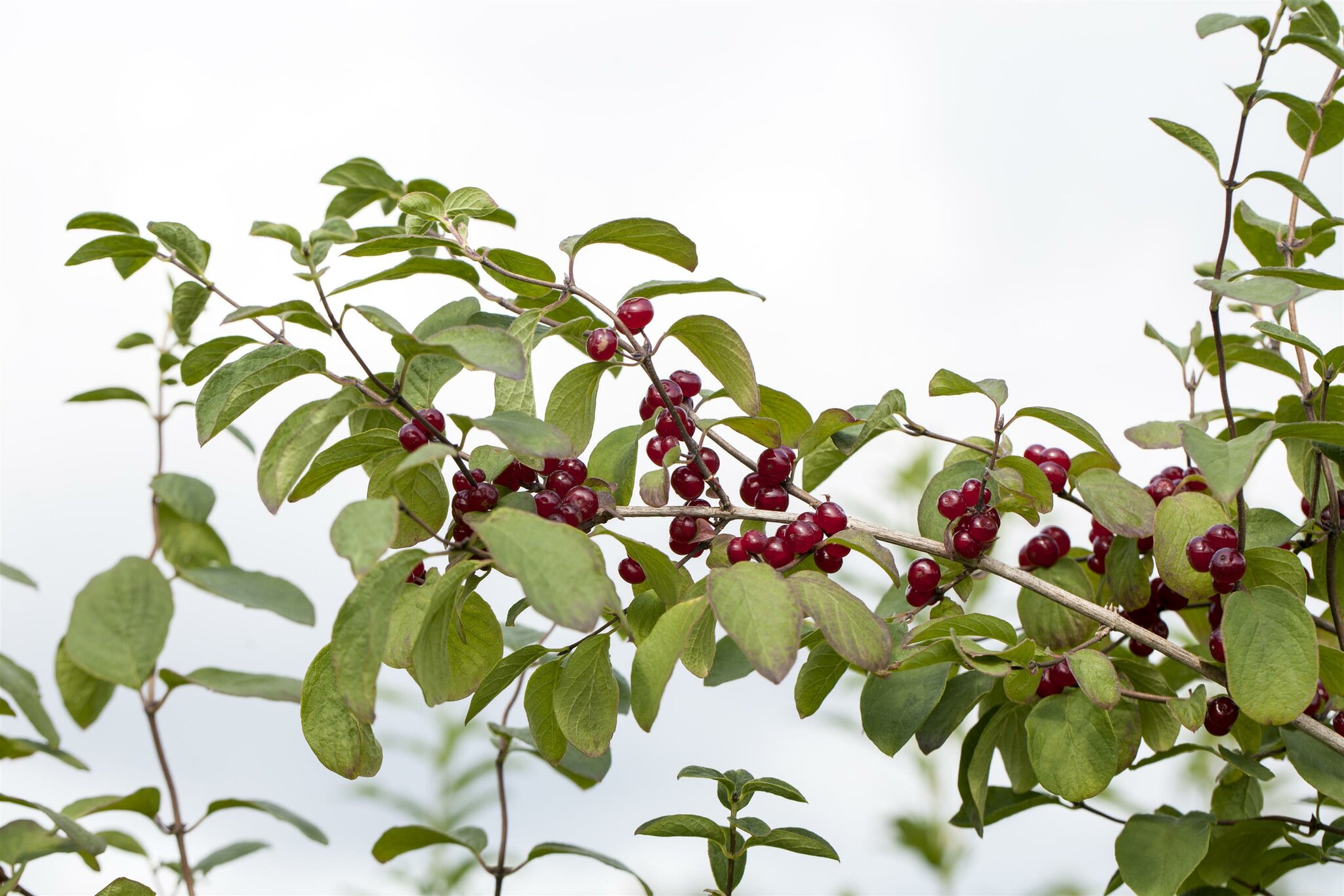 De Lonicera xylosteum geeft kleine bloemen en glanzende rode bessen.