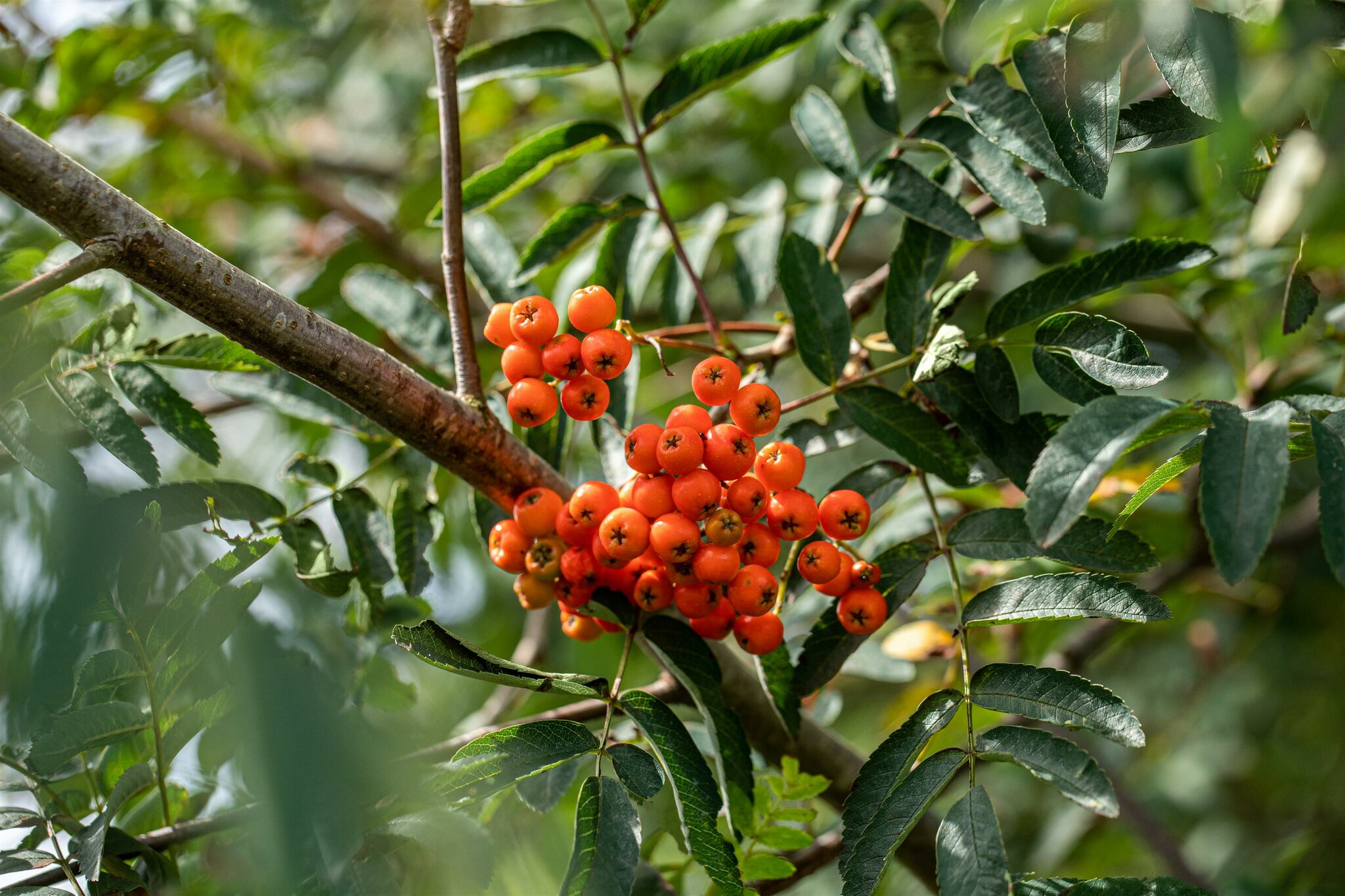 De Sorbus aucuparia is winterhard en geeft witte bloemen in het voorjaar en oranje bessen in de nazomer/herfst.